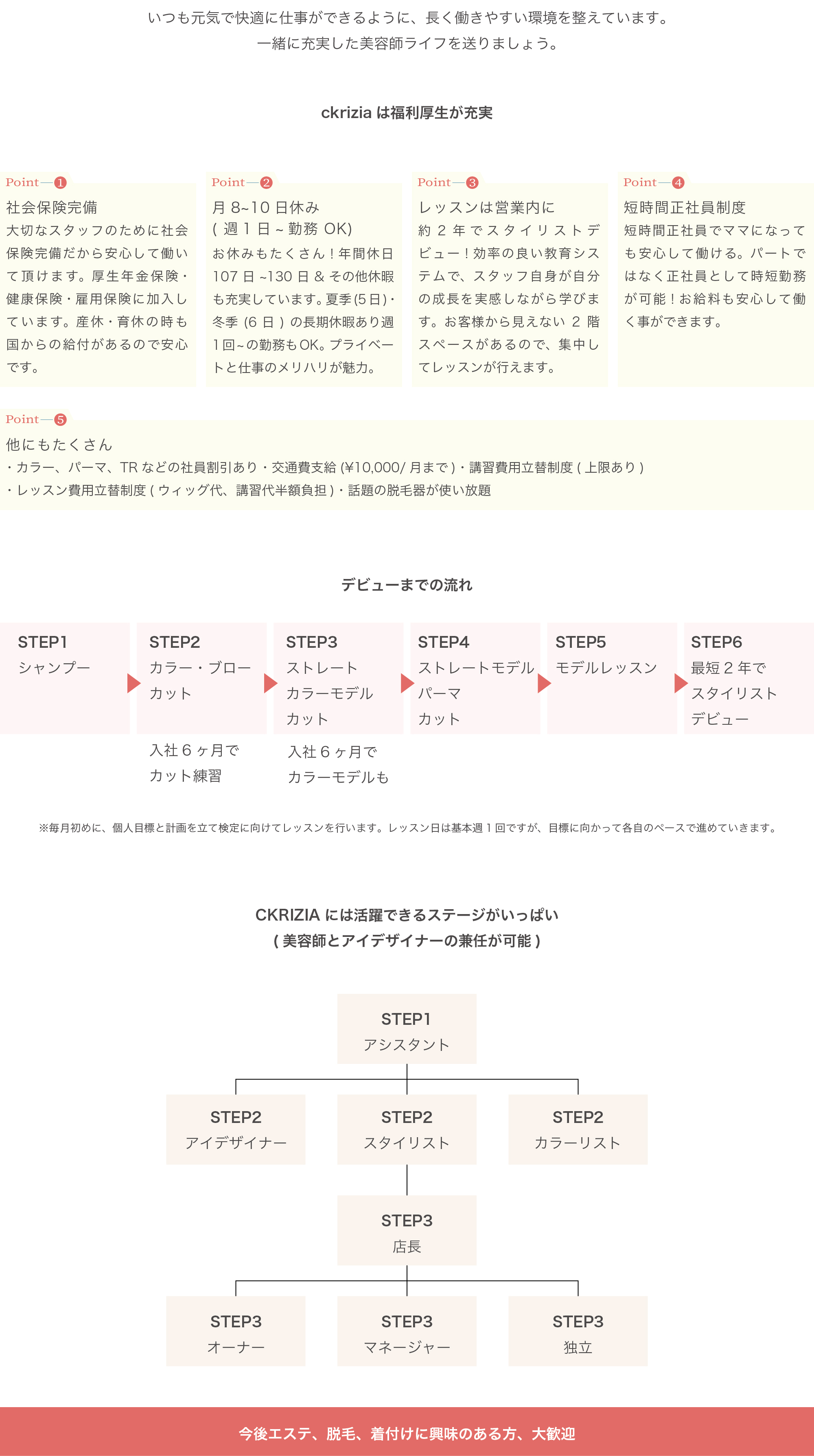 | 給与 | スタイリスト:月給23万円~(昇級・賞与あり) | アシスタント:月給22万円~(昇級・賞与あり) |